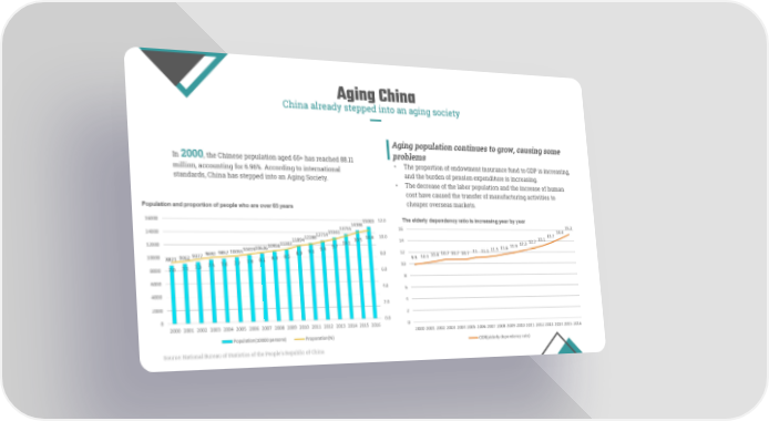 Aging China China already stepped into an aging society Aging population continues to grow, causing some problems In 2000, the Chinese population aged 65+ has reached 88.11 • The proportion of endowment insurance fund to GDP is increasing, million, accounting for 6.96%. According to international and the burden of pension expenditure is increasing. standards, China has stepped into an Aging Society. • The decrease of the labor population and the increase of human cost have caused the transfer of manufacturing activities to cheaper overseas markets. Source: National Bureau of Statistics of the People's Republic of China