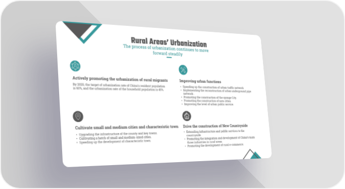 Rural Areas’ Urbanization The process of urbanization continues to move forward steadily Actively promoting the urbanization of rural migrants Improving urban functions By 2020, the target of urbanization rate of China's resident population • Speeding up the construction of urban traffic network. is 60%, and the urbanization rate of the household population is 45%. • Implementing the reconstruction of urban underground pipe network . • Promoting the construction of the sponge City. • Promoting the construction of new cities. • Improving the level of urban public service. Cultivate small and medium cities and characteristic town Drive the construction of New Countryside • Extending infrastructure and public services to the • Upgrading the infrastructure of the county and key towns. countryside. • Cultivating a batch of small and medium-sized cities. • Promoting the integration and development of China’s main • Speeding up the development of characteristic town. three industries in rural areas. • Promoting the development of rural e-commerce.