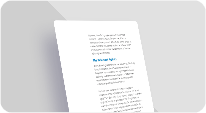 However, introducing agile approaches into their business—a proven means for speeding efforts to innovate and compete—is dicult. But it is no longer an option. Realizing this, several retailers worldwide are on an end-to-end value chain transformation to become agile, digital enterprises. The Reluctant Agilists While there is great enthusiasm across the retail industry for agile adoption, there is also great resistance— frequently from functional managers fearful of losing authority, and from leaders reluctant to flatten their organizations—exacerbated by an industry-wide unfamiliarity with agile fundamentals. We have seen some retailers attempting partial adoptions of the agile approach—what we call ‘proxy agile’. They do this by slicing existing projects into smaller projects, hoping to gain speed. The IT organization’s ways of working may change, but the business decision- makers do not. These projects retain the overall scale of traditional ‘waterfall’ software development projects and thus cannot respond quickly to (or even collect) customer feedback. Nor can they test and release products rapidly enough. As a result, they fail to help retailers make rapid innovations.