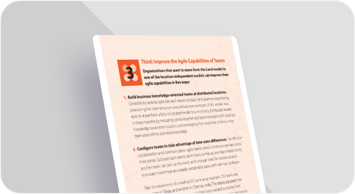 Third: Improve the Agile Capabilities of Teams 3 Organizations that want to move from the Local model to one of the location-independent models can improve their agile capabilities in five ways: 1. Build business knowledge-oriented teams at distributed locations. Consistently seek to optimize each team’s product and business expertise by promoting the team structure around business concepts. A U.S. retailer was able to move from a fully co-located model to a minimally distributed model in three months by relocating some experienced team members with business knowledge to another location, and leveraging their expertise to form a new team around this business knowledge. 2. Configure teams to take advantage of time-zone differences. F or effective collaboration and communication, agile teams need a minimum overlap across time zones. Calibrate each team’s work hours so that as one team heads home, another team can pick up the work, with enough time for communication to ensure it continues at a steady, sustainable pace, with minimal confusion. Take the experience of a leading U.S. bank as an example. The bank had one team in Texas, and another in Chennai, India. The teams adjusted their hours to overlap based on how much time they needed to resolve their interdependencies. They became motivated to improve how they worked to reduce the number of overlapping hours they needed. 3. Minimize planning overhead. An Australian retailer synced up the sprints and product releases of its three agile teams, reducing the teams’ planning time by 20%. To achieve such results, it’s critical to automate as much of the teams’ work as possible using DevOps automation and design engineering practices.