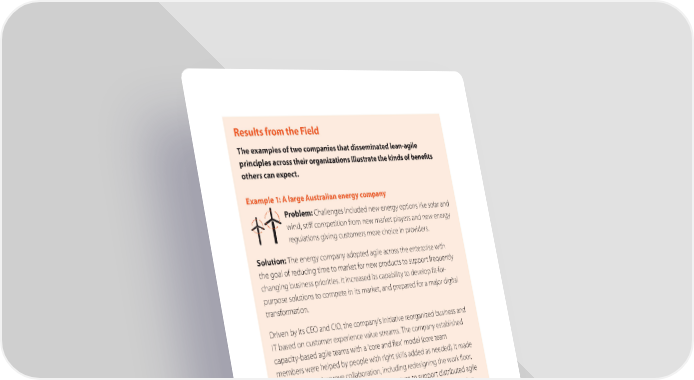 Results from the Field The examples of two companies that disseminated lean-agile principles across their organizations illustrate the kinds of benefits others can expect. Example 1: A large Australian energy company Problem: Challenges included new energy options like solar and wind, stiff competition from new market players and new energy regulations giving customers more choice in providers. Solution: The energy company adopted agile across the enterprise with the goal of reducing time to market for new products to support frequently changing business priorities. It increased its capability to develop fit-for- purpose solutions to compete in its market, and prepared for a major digital transformation. Driven by its CEO and CIO, the company’s initiative reorganized business and IT based on customer experience value streams. The company established capacity-based agile teams with a ‘core and flex’ model (core team members were helped by people with right skills added as needed). It made investments to improve collaboration, including redesigning the work floor, and strengthening the technology infrastructure to support distributed agile teams. It automated software development and operations activities using DevOps practices. Results: The company achieved a 90% reduction in deployment time for software products, a 40% reduction in production incidents that could lead to disruptions, and faster resolutions of application problems, leading to higher customer loyalty.