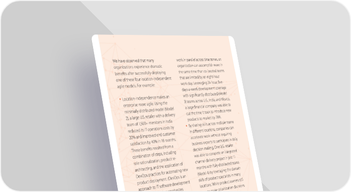 We have observed that many work in parallel across time zones, an organizations experience dramatic organization can accomplish more in benefits after successfully deploying the same time than co-located teams one of these four location-independent that are limited by an eight-hour agile models. For example: work day. Leveraging 24-hour, five- days-a-week development coverage € Location-independence makes an with significantly distributed (Model enterprise more agile. Using the 3) teams across U.S., India, and Mexico, minimally distributed model (Model a large financial company was able to 2), a large U.S. retailer with a delivery cut the time it took to introduce new team of 1,500+ members in India products to market by 78%. € reduced its IT operations costs by By sharing skills across multiple teams 20% and improved end customer in different locations, companies can satisfaction by 40% in 18 months. accelerate work without requiring These benefits resulted from a business experts to participate in daily combination of steps, including decision making. One U.S. retailer role rationalization, product re- was able to complete an integrated architecting, and the application of channel delivery project in just 11 DevOps practices for automating new months with fully distributed teams product deployment. (DevOps is an (Model 4) by leveraging the domain approach to IT software development skills of product specialists in many and operations that emphasizes locations. While product owners still automation to speed up software have to make prioritization decisions building, testing, and installation.) and confirm product acceptance, € Location-independence makes an they can delegate significant enterprise more productive. By using amounts of knowledge work involved all 24 hours available to execute in product development.