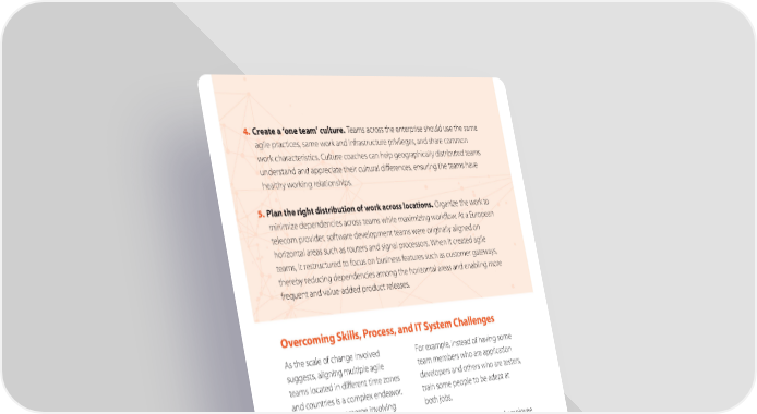 4. Create a ‘one team’ culture. T eams across the enterprise should use the same agile practices, same work and infrastructure privileges, and share common work characteristics. Culture coaches can help geographically distributed teams understand and appreciate their cultural differences, ensuring the teams have healthy working relationships. 5. Pl an the right distribution of work across locations. Organize the work to minimize dependencies across teams while maximizing workflow. At a European telecom provider, software development teams were originally aligned on horizontal areas such as routers and signal processors. When it created agile teams, it restructured to focus on business features such as customer gateways, thereby reducing dependencies among the horizontal areas and enabling more frequent and value-added product releases. Overcoming Skills, Process, and IT System Challenges As the scale of change involved For example, instead of having some suggests, aligning multiple agile team members who are application teams located in different time zones developers and others who are testers, and countries is a complex endeavor. train some people to be adept at Challenges may emerge involving both jobs. shortages of the right skills, employees’ adapting to new work processes, and a Legacy ways of working, and employee company’s IT infrastructure. attitudes toward them, can hinder the cultural change needed to pursue agile. To get the most from location- Some employees will have trouble independent agile teams, an enterprise adapting. They can benefit from needs to put people with the right coaching that goes beyond teaching skills in the right places. In addition to agile techniques to practicing new universal coaching and training in agile roles. Hands-on practice will help them practices, one way to do this is to train understand the benefits of pursuing team members in more than one skill. agile approaches to their own work lives.