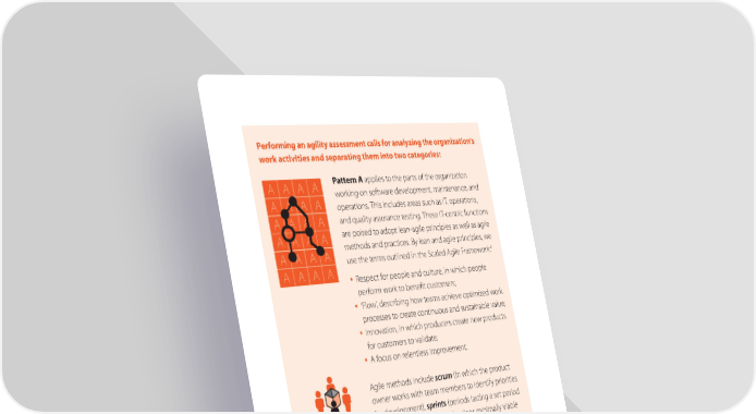 Performing an agility assessment calls for analyzing the organization’s work activities and separating them into two categories: AAAA Pattern A applies to the parts of the organization AAAA working on software development, maintenance, and operations. This includes areas such as IT, operations, AAAA and quality assurance testing. These IT-centric functions AAAA are poised to adopt lean-agile principles as well as agile AAAA methods and practices. By lean and agile principles, we 4 use the terms outlined in the Scaled Agile Framework: AAAA € Respect for people and culture, in which people perform work to benefit customers; € ‘Flow’, describing how teams achieve optimized work pr ocesses to create continuous and sustainable value; € Innovation, in which producers create new products for customers to validate; € A focus on relentless improvement. Agile methods include scrum (in which the product owner works with team members to identify priorities for development), sprints (periods lasting a set period Scrum of time in which the team develops minimally viable products to test), and stand-up meetings (daily, or regular team meetings to get fast status updates). Sprint While in most organizations it’s common for Pattern A activities to occur in IT-centric functions—after all, agile began as a software development movement— they can also occur in other functions. Some Stand-up meetings companies will find these activities in sales (such as with a customer app), or in HR (if recruiting is central to that company’s business model). 4 Scaled Agile Inc., Lean-Agile Mindset, November 17, 2017, accessed March 13, 2018, http://www.scaledagileframework.com/lean-agile-mindset/