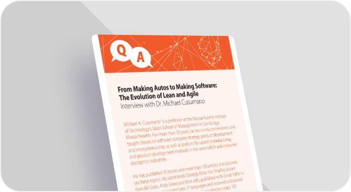 Q A From Making Autos to Making Software: The Evolution of Lean and Agile Interview with Dr. Michael Cusumano 5 Michael A. Cusumano is a professor at the Massachusetts Institute of Technology’s Sloan School of Management in Cambridge, Massachusetts. For more than 30 years, he has conducted research and taught classes on software company strategy, product development and entrepreneurship, as well as (early in his career) manufacturing and product development methods in the automobile and consumer electronics industries. He has published 13 books and more than 120 articles and columns on these topics. His latest book (Strategy Rules: Five Timeless Lessons from Bill Gates, Andy Grove and Steve Jobs, published with David Yoe in 2015) has been translated into 17 languages and received widespread media acclaim. He has also lectured and consulted to nearly 100 organizations around the world. In the last two years, Professor Cusumano had been on leave from MIT and served as VP and Dean at the Tokyo University of Science. Because of his extensive studies over the last four decades on software development, product development, manufacturing, and (more recently) software business strategy, he possesses unique insights on technology and technology-based business strategy and product development. 5 Michael Cusumano, MIT Sloan School of Business, Faculty and Research, accessed March 15, 2018, http://mitsloan. mit.edu/faculty-and-research/faculty-directory/detail/?id=41459