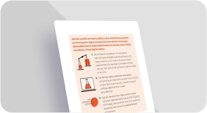 And the need for enterprise agility is clear. Established companies are learning that digital startups have three distinct advantages that enable them to make rapid inroads into markets once ruled by incumbents. These digital natives: 1. Do not have to compete on the same terms, with the same strategies, business processes, and legacy systems as incumbents to pursue market opportunities. (For example, to compete with taxi services, Uber and Lyft do not have to maintain a fleet of vehicles.) 2. Can develop digital systems far more rapidly, 0 using testing, and data from customer trials to ensure 0 1 1 0 a higher likelihood of success. (Consider Amazon’s 0 continual adjustments to its web store offerings.) 0101010 3. Typically develop these digital systems rapidly 10101010101 using lean-agile approaches (as do Airbnb, Spotify, 010101010 and Google, among others) rather than traditional, sequential, time-consuming waterfall project management. While the business urgency to create an agile enterprise is clear, it’s unrealistic to ask every executive running every business function to adopt agile approaches immediately. Eventually, organizations that wish to compete in a digital world will have to embrace agile as a new way of working, but because the transition is a significant shift in how business process and product managers operate, and what they value, asking them to do so at once is likely to be met with resistance.