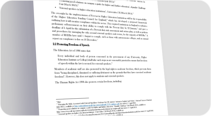 ! •! ‘The Role of Further Education Providers in Promoting Community Cohesion, Fostering Shared Values and Preventing Violent Extremism’, Association of Colleges/Department for Innovation, 16 Universities & Skills (2008); •! ‘Managing the Risks Associated with External Speakers: Guidance for HE students’ unions in 17 England and Wales’, National Union of Students (July 2011); •! ‘Promoting good relations on campus: a guide for higher and further education’, Equality Challenge 18 Unit (March 2013); 19 •! ‘External speakers in higher education institutions’, Universities UK (March 2014). The oversight for the implementation of Prevent in Higher Education Institutions will be the responsibility 20 of the Higher Education Funding Council for England, which has developed a proposed framework outlining how it will monitor compliance within the sector. This required institutions in England to submit a 21 preliminary self-assessment on their ability to comply with the Prevent duty by 22 January, and gave a deadline of 1 April for the submission of a Prevent duty risk assessment and action plan, as well as policies 22 and procedures for managing the risks around external speakers and events, for the majority of RHEBs. A number of RHEBs have until 1 August to comply, such as those with autonomous colleges, and an annual 23 report on compliance is due on 16 December. ! 2.2 Protecting Freedom of Speech The Education Act of 1986 states that: Every individual and body of person concerned in the government of any [University, Higher Education Institute or College] shall take such steps as are reasonably practical to ensure that freedom 24 of speech within the law is secured for external speakers. Members of academic staff are also protected by the legal right to academic freedom, which prevents them from “being disciplined, dismissed or suffering detriment on the grounds that they have exercised academic freedom”. However, this does not apply to students and external speakers. The Human Rights Act 1998 also protects certain freedoms, including: !!!!!!!!!!!!!!!!!!!!!!!!!!!!!!!!!!!!!!!!!!!!!!!!!!!!!!!!!!!!! 16 Ibid. 17 ‘Managing the Risks Associated with External Speakers: Guidance for HE students’ unions in England and Wales’, National Union of Students (July 2011), available at: http://antisemitism.org.uk/wp-content/uploads/NUS-Guidance.pdf, last visited: 17 April 2016. 18 ‘Promoting good relations on campus: a guide for higher and further education’, Equality Challenge Unit (March 2013), available at: http://www.ecu.ac.uk/wp-content/uploads/external/promoting-good-relations-on-campus.pdf, last visited: 17 April 2016. 19 ‘External speakers in higher education institutions’, Universities UK (March 2014), available at: http://www.universitiesuk.ac.uk/highereducation/Documents/2013/ExternalSpeakersInHigherEducationInstitutions.pdf, last visited: 17 April 2016. 20 ‘Prevent duty guidance: a consultation’, HM Government, December 2014, p.21, available at: https://www.gov.uk/government/uploads/system/uploads/attachment_data/file/388934/45584_Prevent_duty_guidance- a_consultation_Web_Accessible.pdf, last visited: 17 April 2016. 21 ‘Prevent duty monitoring: Preliminary self-assessment returns’, HEFCE, December 2015, available at: http://www.hefce.ac.uk/pubs/year/2015/CL,272015/, last visited: 17 April 2016. 22 ‘Prevent duty monitoring framework, Phase 1: Request for documentation from relevant higher education bodies’, HEFCE, available at: http://www.hefce.ac.uk/pubs/year/2016/CL,022016/, last visited: 17 April 2016. 23 ‘Monitoring of the Prevent duty’, HEFCE, available at: http://www.hefce.ac.uk/reg/prevent/framework/#timeline, last visited: 17 April 2016. 24 ‘Education (No. 2) Act 1986’, HM Government, 7 November 1986, available at: http://www.legislation.gov.uk/ukpga/1986/61, last visited: 17 April 2016. 8! !