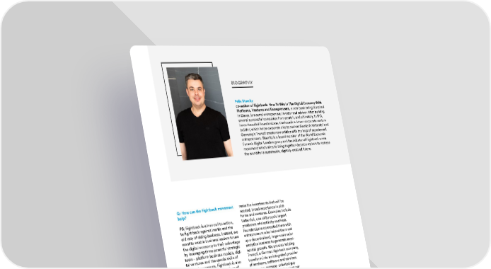 14COVER STORY 15 Helping European BIOGRAPHY Felix Staeritz co-author of Fightback: How To Win In The Digital Economy With Platforms, Ventures and Entrepreneurs , a new book being launched Corporates Punch in Davos, is a serial entrepreneur, investor and adviser. After building several successful companies from scratch, and ultimately, to IPO, he co-founded FoundersLane, the founders driven corporate venture builder, which helps corporate clients such as Sweden’s Vattenfall and Their Weight In The Germany’s Trumpf create new entities with the help of experienced entrepreneurs. Staeritz is a board member of the World Economic Forum’s Digital Leaders group and the initiator of Fightback a new movement which aims to bring together decision-makers to reshape Digital Era the world for a sustainable, digitally-enabled future. Q: In the Fightback book you and assets and Q:Europe seems Q: How can the Fightback movement make the investments that will be your co-author note that fewer than humanto be further help?needed. broad experience in plat- 20% of the investments in digitization skills andbehind than the forms and ventures. Examples include made by large companies in Europe expertise, andU.S. and China. FS: Fightback is a true call to action,Vattenfall, one of Europe’s largest and in the U.S. have had any positive the networks, How can Euro-to fight back against inertia and theproducers of electricity and heat. impact on financial performance platforms and pean companies old way of doing business. Instead, we FoundersLane connected them with once the cost of capital is taken into technologies fight back?want to enable business leaders to use entrepreneurs who helped them set account. Why do you think this is the that the digital the digital economy to their advantage up a decentralized, large-scale solar case?revolutionFS: We haveby leveraging three powerful strategic analytics business to generate expo- is making seen substantialtools – platform business models, digi-nential growth. We are also helping FS: On the whole, their initiatives available. The parts oftal ventures and the special skills ofTrumpf, a German high tech company, have been limited to incremental problem, of the Europeantech entrepreneurs. Fightback is also transform into an integrated provider modernization of the core business, course, for the economy lagabout sharing the best practices of of hardware, software and services. rather than radical transformation. incumbent behind becauseglobal entrepreneurs, academics and I am a very purpose- oriented guy The main problems include a rate of businesses is of an inability orcorporate and digital leaders to actual-and I believe hybrid models that pair adjustment that is too slow, the false that they just unwillingness toly get going. The movement brings entrepreneurs with big companies are assumption that adopting a range of can’t throw the see that yester-everyone together in order to identify very necessary. This approach – and digital tools and interfaces will be cards up n the day’s successthe biggest topics and challengesour movement – is for companies enough to put things right and the air, walkoffers noand then closely cooperate to take that don’t want to just think about failure to match digital initiatives with away fromguarantees forjoint action: which solutions, platforms the future but to act upon it and seize the necessary cultural and business their traditional sources of revenue tomorrow. The stage is set for a digital and ventures can be used to effec-opportunities offered by Digitization. model changes.and profit and bet the farm on their recession, home-grown and self-inflic-tively fight back. ability to pull it off and create an ted, caused by the hubris that hasQ: How do interested companies join Q: The book talks a lot about the equally profitable and durable digital led our nations to ignore the radical Q: What is the relationship between the Fightback movement? platform business model and its platform business from scratch. And impact of digital transformation. ButFoundersLane and Fightback? power to leverage new technologies, it’s not that easy to make the kind if the digital revolution poses threatsFS: Our movement is just as dynamic economic and social trends and the of change that Apple, Amazon and it also offers solutions. Europe hasFS: FoundersLane and Fightback are as digitization, so this is the right time hidden value of the abundant and Microsoft did and build the platform some 2000 world-leading specialist connected by a shared purpose. Theto join Fightback, gaining valuable detailed data they generate. Why model into your strategy. Our research companies, with the advanced skillsFightback movement pursues theinsights in order to benefit from digital haven’t more traditional companies shows that while there’s plenty of and knowledge to potentially lead the overall mission, and the book explainschange. As a first step, on Fightback. adopted this model?awareness, interest and experimen-way once they have grasped digital.the reason why we have started Foun-com, you can learn about the latest tation, only 2% of established com-We are seeing some signs – especially dersLane: It provides the foundationdevelopments and join online. Al- FS: The big opportunity for the incu-panies have effectively incorporated in recent months – of a new European for the daily operations and business though we are starting with Europe, mbent leaders in almost every sectora platform strategy into their overall determination to take the actions andthere.the movement is open to established is the possibility of creating a hybrid plans for the future. So, there is a long make the investments that will be Established companies and govern-companies based elsewhere. Our goal business that successfully exploitsway to go.needed.ments have amazing but untappedis to scale the movement in 2020. both existing strengths, physical assets and our entrepre