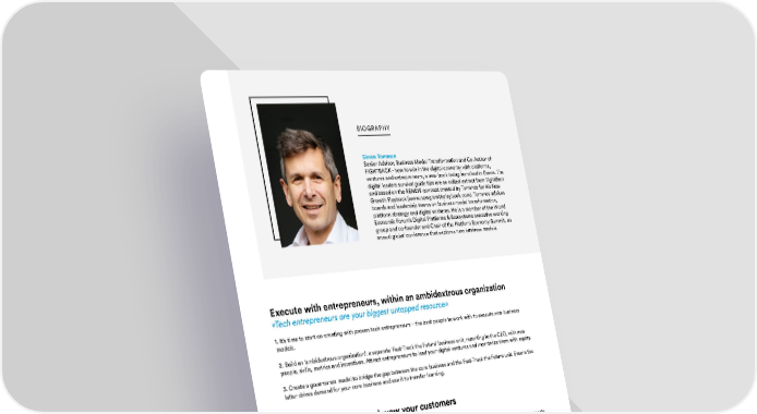 12COVER STORY COVER STORY 13A BIOGRAPHY Simon Torrance Senior Advisor, Business Model Transformation and Co-Author of FIGHTBACK - how to win in the digital economy with platforms, ventures and entrepreneurs, a new book being launched in Davos. The Digital Leader’s digital leaders survival guide tips are an edited extract from FightBack and based on the RENEW concept created by Torrance for his New Growth Playbook (www.newgrowthplaybook.com). Torrance advises boards and leadership teams on business model transformation, Survival Guide platform strategy and digital ventures. He is a member of the World Economic Forum’s Digital Platforms & Ecosystems executive working Five key steps to renew your business model group and co-founder and Chair of the Platform Economy Summit, an annual global conference that explores new business models. and compete effectively in future Reset how you think about sources of growth and value.Execute with entrepreneurs, within an ambidextrous organization «If ever there was an industry ripe for disruption... it’s every industry»«Tech entrepreneurs are your biggest untapped resource» 1. The way you think determines how you act, which determines what you get in terms of performance. This is where 1. It’s time to start co-creating with proven tech entrepreneurs – the best people to work with to execute new business leaders need to start.models. 2. Re-educate yourself and your teams on the types of business models that perform best in a digital economy. Without 2. Build an ‘ambidextrous organization’: a separate ‘Fast-Track the Future’ business unit, reporting to the CEO, with new this, you won’t make the breakthroughs that will unleash your growth potential.people, skills, metrics and incentives. Attract entrepreneurs to lead your digital ventures and incentivize them with equity. 3. At the same time, optimize every aspect of the current business, including decision-making, with software and data 3. Create a governance model to bridge the gap between the core business and the Fast-Track the Future unit. Ensure the intelligence.latter drives demand for your core business and use it to transfer learning. Envision new ecosystems and your role within them.Widen your appeal and wow your customers «If you don’t have a platform strategy, you don’t have a strategy»«Leverage others to serve your customers better» 1. McKinsey has forecast that 30% of global economic activity will be mediated by platforms within new ecosystems in five 1. The most customer-centric businesses on earth leverage others to serve their customers. You needn’t own all the assets. years’ time. What ecosystems will you be operating in and which could you orchestrate?Think of all those third-party developers and merchants supplying Apple’s App Store and Alibaba’s platforms. 2. You’ll need a very different approach to market analysis to understand the new opportunities and threats.2. Reconceive yourself as orchestrating an ecosystem of innovation, not just as a supplier of products and services. 3. What types of platform strategy do you need to be successful in this different world? There are ten different types. Work 3. Incentivize others to work with and through you. The most important third parties to leverage are entrepreneurs and through them to find which would suit you best.developers – your key resource to create new growth and value. Nontraditional approaches to capital allocation «Put your money where the money is» 1. Capital allocation is the most effective way of translating strategy into action. Share buy-backs and ‘innovation theatre’ won’t move the needle. It’s time to be bold. 2. Invest in the business models that can make the difference; don’t just digitize existing out-of-date business models. 3. Create a portfolio of digital investments and platform-based ventures. Be sure they are strategically relevant, not armslength investments. Allocate 10% of your budget to them.