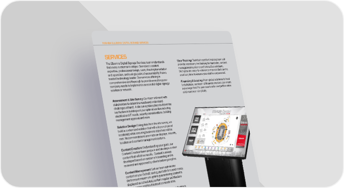 TOSHIBA ELLUMINA DIGITAL SIGNAGE SERVICES SERVICES The Ellumina Digital Signage Services team understands User Training: Toshiba’s certified training team will that every customer is unique. Our value is content provide necessary live training for hardware, content expertise, professional design, worry-free implementation management systems and interactive solutions. and operation, and a single point of accountability from a We’ll provide easy-to-reference manuals that can be trusted technology leader. Our services offering is used any time to ensure your staff is empowered. comprehensive and thorough to provide everything your Financing & Leasing: From global solutions to local company needs to implement a successful digital signage installations, our team of financial masters can create solution or network. a package that fits your needs with competitive rates and maximum simplicity. Assessment & Site Survey: Our team will meet with stakeholders to determine needs and understand challenges at hand. A site survey takes place to determine key factors in building out your optimal solution including electrical and IT needs, security considerations, building management approval and more. Solution Design: Using data from the site survey, we build a customized solution that will suit your physical location(s) while ensuring business objectives will be met. Recommendations are made on displays, mounts, location and content management systems. Content Creation: Understanding your goals, our Content Creation team jumps in and develops custom content that will drive results. Content is always developed based on customer’s branding and is reviewed and approved by clients before going live. Content Management: Let our team administer content on your behalf, saving you both time and money. We’ll ensure maximum uptime guaranteeing content is displayed as scheduled, perform regular architecture maintenance and troubleshoot as needs arise. Project Management: From beginning to end, Toshiba’s Ellumina Digital Signage Services team is here to ensure a seamless experience for you. We’ll assist in identifying unique situations to be addressed such as building permits, wall reinforcement, necessary cabling and more. We can manage post implementation projects such as digital signage upgrades and installation of additional units. Installation & Service: Nationwide installation and service coverage is custom-configured to suit the needs of your business. We can provide service and support to specific locations, regional geographic areas and even manage your entire digital signage operation without the hassle of dealing with multiple vendors and service providers.