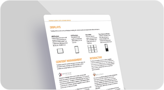 TOSHIBA ELLUMINA DIGITAL SIGNAGE SERVICES DISPLAYS Toshiba offers a wide variety of displays meeting all customer needs and requirements without limitations. LED Displays: LCD Displays: Video Walls: Touch Screens & Kiosks: Outstanding performance with Unmatched image Seamless canvas in Available in assorted screen energy-saving technology to quality and sharpness custom sizes and shapes sizes with landscape or deliver stunning content. Low with reliability you can with outstanding image portrait orientation and maintenance with long service count on. quality and maximum durable stands that can be life of up to 100,000 hours. brightness. easily moved or bolted down. CONTENT MANAGEMENT INTERACTIVE Toshiba’s powerful content management systems give you Toshiba’s interactive solutions deliver engaging the tools to easily manage your digital signage content customer experiences to promote your products or whether on a single display or networked solution. services in a compelling manner. We collaborate with each customer to understand their offering and then build a custom solution that will take users from passive to active. Experience Manager allows you to create, manage and distribute content to networked digital displays. Comprised of three components – Designer, Content Manager and Player, it Virtuoso is a cost-effective interactive solution designed for provides a centralized solution capable of delivering targeted high-use environments. Perfect for one-to-one or content by time, location and demographic to ensure delivery one-to-few interactions, Virtuoso allows you to inform, across one or many touch points. educate, entertain or influence all via the power of touch. Designer offers easy-to-use data-driven templates to create Exceptional functionality allows users to explore, expand, • mark up content, watch videos, play games and access custom content. Rich in features, it can easily integrate information. with third party enterprise systems and offers interactive (touch) capabilities without requiring programming skills. Virtuoso is our most popular touch solution and has been Content Manager makes organizing, scheduling and developed for a variety of markets including retail, education, • healthcare, travel, hotel, banking, government, stadiums/ managing your content simple. Cloud or server-based, arenas and points of interest. Virtuoso can provide simple it is easily deployed from a central location and offers information such as a self service directory or more flexible scheduling options. You can assign event triggers, advanced capabilities such as wayfinding. Toshiba’s team incorporate real-time adaption, assign permission- will design an interactive solution to help patrons find where based access and generate logs and reports. they are going and get there with ease. Functionality can be The Player drives content to your screens with • simple such as a displayed map or advanced – pushing step reliable smooth sub-pixel delivery. It ensures stable by step instructions to users’ mobile devices. playback of graphics, sound and video files and provides seamless interruption-free updating with Toshiba’s content experts work closely with each client to real time data insertion such as news and weather. understand objectives and then collaborate with designers to build an application to achieve those targets. Other interactive Experience Manager offers a breadth of capabilities to easily solutions include a custom kiosk for ultra-fast wireless data deliver and manage communications at a low monthly cost as transfer, an Up Sell application that displays relevant well as comprehensive plans that ensure a robust and secure information on screen when a product is lifted from its in-store operating system with maximum uptime. shelf, and digital signage controlled and updated by event triggers such as inventory, weather, time, etc.
