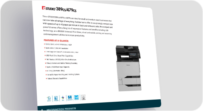 The e-STUDIO389cs/479cs MFPs are ideal for small and medium-sized businesses that can now take advantage of everything Toshiba has to offer, in a surprisingly compact size. With speeds of up to 42 pages per minute in black and white and color, this compact and powerful series offers a long list of impressive features and benefits including LED technology, an e-BRIDGE Universal Print Driver, cloud and mobile printing and scanning and management utilities to increase productivity. FEATURES AT A GLANCE: ● 30/30, 35/37, 42/42 PPM Color / B&W ● Up to 600 x 1,200 DPI Resolution ● First Copy Out Time of 13 Seconds Color / B&W ● USB Flash Drive Scan/Print Capabilities ● Net-Ready, e-BRIDGE All-in-One Architecture ● Cloud, Internet and Mobile Printing/Scanning ● Up to 3,160-Sheet Input Capacity ● e-Filing (Electronic Filing) ● Versatile Paper-Handling and Finishing Options ● Robust Security Capabilities Color PPM S 30/35/42 Workgroup Color Multifunction 5 MULTIFUNCTION PRODUCTS