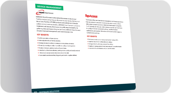 DEVICE MANAGEMENT Cloud Connect e-BRIDGE Cloud Connect works behind the scenes to ensure your TopAccess offers real-time device management and displays job status Toshiba products are giving you the most for your money. Natively built from any network computer. As soon as any event occurs, such as into all new Toshiba e-STUDIO products and available as a firmware when paper or toner runs out, or whenever maintenance is required, update on most previous models, e-BRIDGE Cloud Connect is simple to it will instantly alert the user. Administrators can also use TopAccess implement and secure, allowing you to quickly reap the benefits. By to configure the device/network settings, install embedded gathering data and transmitting via the Cloud, e-BRIDGE Cloud Connect applications, set counter information or limit and control usage via ensures improved management and faster response time. authentication settings. KEY BENEFITS KEY BENEFITS ● Continuous status of your devices ● Web-based remote device management tool for Toshiba MFPs ● Make adjustments on the fly, remotely ● Graphical view of MFP configuration and settings ● Manage devices to adhere to company or regulatory standards ● Manage network, print, copy, scan and fax settings ● Remotely reconfigure entire fleet with one policy or configuration ● Create and manage address book, templates and user authentication ● Remote firmware updates during off-peak hours ● Email alerts for administrator and/or user intervention ● Data backup functions allowing settings to be quickly and easily restored ● Meter reads are automatically taken at set intervals ● Toner alerts are transmitted, triggering automatic supplies delivery 37 SOFTWARE SOLUTIONS