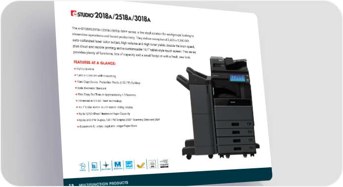 The e-STUDIO2018A/2518A/3018A MFP series is the ideal solution for workgroups looking to streamline operations and boost productivity. They deliver exceptional 2,400 x 1,200 DPI auto-calibrated laser color output, high-volume and high-toner yields, double the scan speed, plus cloud and mobile printing and a customizable 10.1” tablet-style touch screen. This series provides plenty of functions, lots of capacity and a small footprint with a fresh, new look. FEATURES AT A GLANCE: ● 20/25/30 PPM ● 2,400 x 1,200 DPI with Smoothing ● Hard Copy Device- Protection Profile (HCD-PP) Certified ● Data Overwrite Standard ● First Copy Out Time of Approximately 4.3 Seconds ● Advanced e-BRIDGE Next Technology ● 10.1” Color WVGA Touch Screen Tilting Display ● Up to 3,200-Sheet Maximum Paper Capacity ● Up to 240 IPM Duplex, 120 IPM Simplex DSDF Scanning Color and B&W ● Statement-R, Letter, Legal and Ledger Paper Sizes PPM SM 20/25/30 Workgroup Black & White Multifunction 13 MULTIFUNCTION PRODUCTS