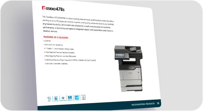The Toshiba e-STUDIO478S is a hard-working monochrome multifunction printer that offers printing at up to 50 pages per minute, superior print quality, enhanced security and skillfully engineered durability. All of which are powered by a quad-core processor to maximize performance. A hard drive and optional integrated stapler add capabilities rarely found on desktop devices. FEATURES AT A GLANCE: ● 50 PPM ● 600 x 600 DPI Resolution ● 7” Color TFT Touch Screen Tilting Display ● First Copy Out Time as Fast as 6 Seconds ● First Copy Out Time of Less than 8 Seconds ● 650-Sheet Standard Paper Capacity; 2,300-Sheet Maximum Paper Capacity ● Standard Automatic Duplexing PPM M 49/55 Workgroup Black & White Multifunction MULTIFUNCTION PRODUCTS 10