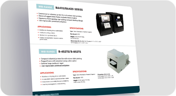 MID-RANGE BA410/BA420 SERIES ● Commercial or industrial printer for mid-volume label printing ● Choice of rugged metal frame or plastic frame models ● Ergonomic front-opening, top-loading compact desktop design ● User-replaceable printhead and platen APPLICATIONS: SPECIFICATIONS: ● Warehouse shipping, bin or pallet labels Type: Direct Thermal or Thermal Transfer ● Retail product tags, labels Max Speed: 8 IPS ● Medical, lab, specimen labels Weight: B-SA410 37.5 lbs. ● Courier, transportation, logistics carton, BA420 26.5 lbs. pallet labels Dimensions (W x H x D): BA410 series 9.4” x 13.1” x 16.3” BA420 series 9.4” x 13.1” x 13.7 MID-RANGE / B-452TS B-852TS ● Compact industrial printers for mid-volume label printing ● Rugged frame with industrial swing cutter option ● External large media roll input ● User-replaceable printhead and platen APPLICATIONS: SPECIFICATIONS: ● Warehouse shipping, bin or pallet labels Type: Direct Thermal or Thermal Transfer Dimensions (W x H x D): Max Speed: 4 IPS B-452 series 10.5” x 9.6” x 7.8” ● In-store shelf labels or promotion item labels B-852 series 15.2” x 9.6” x 16.8” ● Production or assembly line product labeling Weight: B-452 series 11.5 lbs. ● Inventory management, cross-docking B-852 series 34.5 lbs. 21 BARCODE PRINTERS