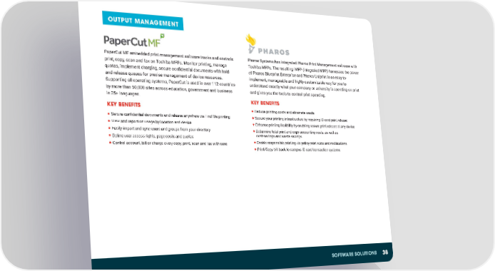 OUTPUT MANAGEMENT PaperCut MF embedded print management software tracks and controls Pharos Systems has integrated Pharos Print Management software with print, copy, scan and fax on Toshiba MFPs. Monitor printing, manage Toshiba MFPs. The resulting iMFP (integrated MFP) harnesses the power quotas, implement charging, secure confidential documents with hold of Pharos Blueprint Enterprise and Pharos Uniprint in an easy-to- and release queues for precise management of device resources. implement, manageable and highly customizable way for you to Supporting all operating systems, PaperCut is used in over 112 countries understand exactly what your company or university is spending on print by more than 50,000 sites across education, government and business and gives you the tools to control print spending. in 25+ languages. KEY BENEFITS KEY BENEFITS ● Reduce printing costs and eliminate waste ● Secure confidential documents and release anywhere via Find Me printing ● Secure your printing infrastructure by requiring ID card print release ● View and report on usage by location and device ● Enhance printing flexibility by enabling secure print release at any device ● Easily import and sync users and groups from your directory ● Determine total print and copy accounting costs, as well as ● Define user access rights, page costs and quotas cost-savings and waste savings ● Control account, bill or charge every copy, print, scan and fax with ease ● Enable responsible printing via policy print rules and notifications ● Print/Copy bill-back to campus ID card transaction systems SOFTWARE SOLUTIONS 38
