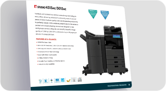 Toshiba’s e-STUDIO4515AC/5015AC series brings technology to every office, delivering advanced functionality, ease of use and peace of mind. It allows quality color and impressive productivity to perfectly coexist. With a relatively small footprint, this series is packed with industry-leading innovations designed to help workgroups connect, integrate and simplify. Beautiful image quality at 1,200 by 1,200 DPI is delivered at up to 50 pages per minute. It’s simply brilliant. FEATURES AT A GLANCE: ● 45/50 PPM Color / B&W ● 600 x 600 DPI Resolution, 1,200 x 1,200 DPI Resolution (PS3 Only) ● First Copy Out Time of 5.7 Seconds Color, 4.4 Seconds B&W ● Advanced e-BRIDGE Next Technology ● Up to 3,200-Sheet Input Capacity ● e-Filing (Electronic Filing) ● Versatile Paper-Handling and Finishing Options ● Robust Security Capabilities Color PPM L 45/50 Workgroup Color Multifunction MULTIFUNCTION PRODUCTS 8