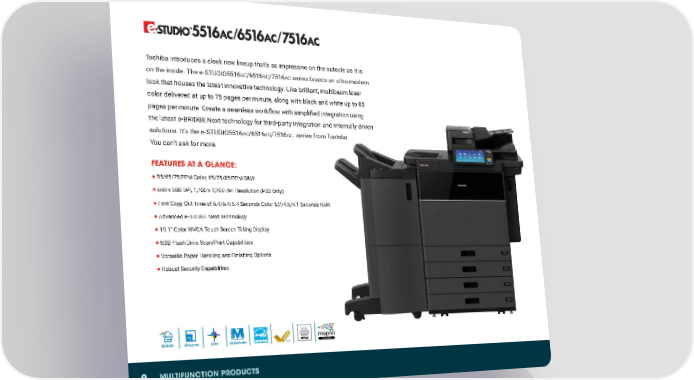 Toshiba introduces a sleek new lineup that’s as impressive on the outside as it is on the inside. The e-STUDIO5516AC/6516AC/7516AC series boasts an ultra-modern look that houses the latest innovative technology. Like brilliant, multibeam laser color delivered at up to 75 pages per minute, along with black and white up to 85 pages per minute. Create a seamless workflow with simplified integration using the latest e-BRIDGE Next technology for third-party integration and internally driven solutions. It’s the e-STUDIO5516AC/6516AC/7516AC series from Toshiba. You can’t ask for more. FEATURES AT A GLANCE: ● 55/65/75 PPM Color, 65/75/85 PPM B&W ● 600 x 600 DPI, 1,200 x 1,200 DPI Resolution (PS3 Only) ● First Copy Out Time of 6.4/6.4/5.4 Seconds Color 5.2/4.5/4.1 Seconds B&W ● Advanced e-BRIDGE Next Technology ● 10.1” Color WVGA Touch Screen Tilting Display ● USB Flash Drive Scan/Print Capabilities ● Versatile Paper-Handling and Finishing Options ● Robust Security Capabilities Color PPM L 55/65/65 Workgroup Color Multifunction 9 MULTIFUNCTION PRODUCTS