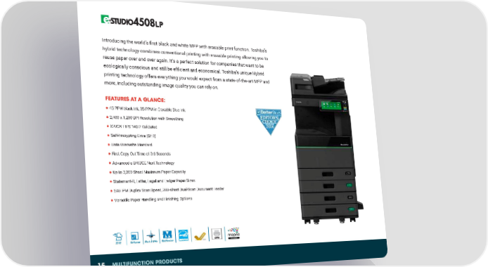 Introducing the world’s first black and white MFP with erasable print function. Toshiba’s hybrid technology combines conventional printing with erasable printing allowing you to reuse paper over and over again. It’s a perfect solution for companies that want to be ecologically conscious and still be efficient and economical. Toshiba’s unique Hybrid printing technology offers everything you would expect from a state-of-the-art MFP and more, including outstanding image quality you can rely on. FEATURES AT A GLANCE: ● 45 PPM black Ink, 35 PPM in Erasable Blue Ink ● 2,400 x 1,200 DPI Resolution with Smoothing ● 320GB FIPS 140-2 Validated ● Self-Encrypting Drive (SED) ● Data Overwrite Standard ● First Copy Out Time of 3.6 Seconds ● Advanced e-BRIDGE Next Technology ● Up to 3,200-Sheet Maximum Paper Capacity ● Statement-R, Letter, Legal and Ledger Paper Sizes ● 240 IPM Duplex Scan Speed, 300-sheet Dual-Scan Document Feeder ● Versatile Paper Handling and Finishing Options PPM L M 35/45 Workgroup Black & White Multifunction 15 MULTIFUNCTION PRODUCTS
