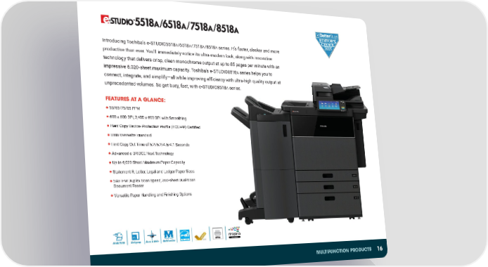 Introducing Toshiba’s e-STUDIO5518A/6518A/7518A/8518A series. It’s faster, sleeker and more productive than ever. You’ll immediately notice its ultra-modern look, along with innovative technology that delivers crisp, clean monochrome output at up to 85 pages per minute with an impressive 6,020-sheet maximum capacity. Toshiba’s e-STUDIO8518A series helps you to connect, integrate, and simplify—all while improving efficiency with ultra-high quality output at unprecedented volumes. So get busy, fast, with e-STUDIO8518A series. FEATURES AT A GLANCE: ● 55/65/75/85 PPM ● 600 x 600 DPI, 2,400 x 600 DPI with Smoothing ● Hard Copy Device- Protection Profile (HCD-PP) Certified ● Data Overwrite Standard ● First Copy Out Time of 5.2/5.2/4.5/4.1 Seconds ● Advanced e-BRIDGE Next Technology ● Up to 6,020-Sheet Maximum Paper Capacity ● Statement-R, Letter, Legal and Ledger Paper Sizes ● 240 IPM Duplex Scan Speed, 300-sheet Dual-Scan Document Feeder ● Versatile Paper Handling and Finishing Options PPM L 55/65/75/85 Workgroup Black & White Multifunction MULTIFUNCTION PRODUCTS 16