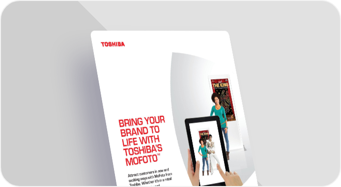 BRING YOUR BRAND TO LIFE WITH TOSHIBA’S MOFOTOTM Attract customers in new and exciting ways with MoFoto from Toshiba. Whether it’s in a retail setting or sports and entertainment venue, your customers will be captivated with this unique integration of augmented reality and digital signage that expands your brand. It’s a great way for you to increase customer and fan engagement, elevate the in-store experience, provide incentives and gaming interaction.