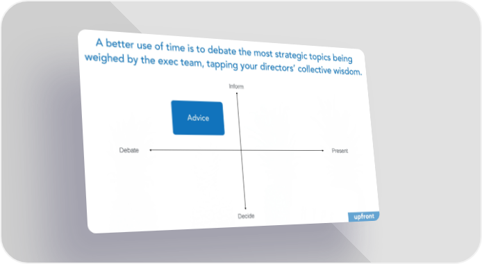 A better use of time is to debate the most strategic topics being weighed by the exec team, tapping your directors’ collective wisdom. Inform Advice Debate Present Decide