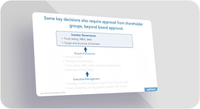 Some key decisions also require approval from shareholder groups, beyond board approval. Investor Governance • Fund raising, M&A, debt • Scope and structure of business Board of Directors • Annual budget • Strategy & performance • Fund raising, M&A, audit, executive compensation • Exec team hiring / firing Executive Management • Strategy, monthly budgets, hiring / firing, financial results • Sales, marketing, pricing, product, support, HR, finance Source: Mark Suster, Both Sides of the Table