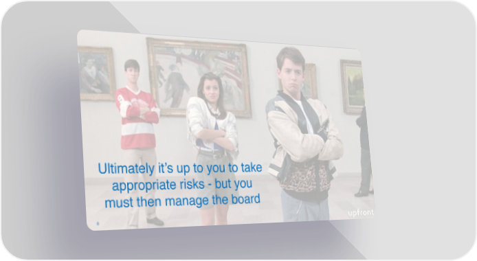 Managing Your Startup Board Page 7 Page 9Ultimately it’s up to you to take appropriate risks - but you must then manage the board 8