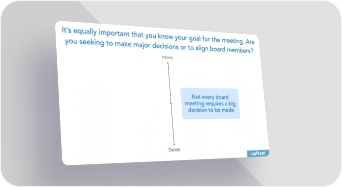 It’s equally important that you know your goal for the meeting. Are you seeking to make major decisions or to align board members? Inform Not every board meeting requires a big decision to be made Decide