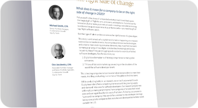 IN TIMES OF CHAOS CHOOSE TO INNOVATE INVESTMENT DISCOVERIES Uncovering innovation on the right side of change What does it mean for a company to be on the right side of change in 2020? Put yourself in the shoes of a respected entertainment brand that’s given the magical gift of flight to cars, caretakers, and elephants. You’re known for innovation, but to make your next act work—creating a wearable technology Michael Smith, CFA to enhance the guest experience at your theme parks—you need the gift of Senior Portfolio Manager, top-flight software talent. Fundamental Growth Equity Team But that type of talent can be as elusive as the rightful owner of a glass slipper. This story is emblematic of a digital transformation happening on a massive scale across corporate America. As companies embrace new technologies and strive to meet evolving consumer demands, they must find the talent to manage an array of new digital complexities. Increasingly and across industries, these firms are struggling to do so due to a scarcity of skilled software developers. Two forces are at play: 1. Digital transformation is of strategic importance to many global companies. Ozo Jaculewicz, CFA 2. Trillions of dollars in market cap are resting on the shoulders of the Associate Portfolio Manager search for software developer talent. and Senior Portfolio Specialist, Fundamental Growth Equity Team This is leading companies to turn to external service providers to meet their needs. And they are hunting in all corners of the globe to find this talent. While conducting bottom-up research, we on the Fundamental Growth Equity team identified a compelling theme around this growing supply- and-demand imbalance for software developers. Our research analysts met with multiple management teams from companies of all sizes that noted over and over again how hard it was to find talent. Following our process to “surround the company,” the search for a solution to the developer shortage led our analysts to companies that recruited and developed skilled labor pools outside the U.S. 1 million Number of IT jobs unfilled in the U.S. 80% of about 2,800 Tech-hiring decision-makers at U.S. firms who identified lack of IT talent as a key challenge Sources: IT trade group CompTIA and Robert Half 6
