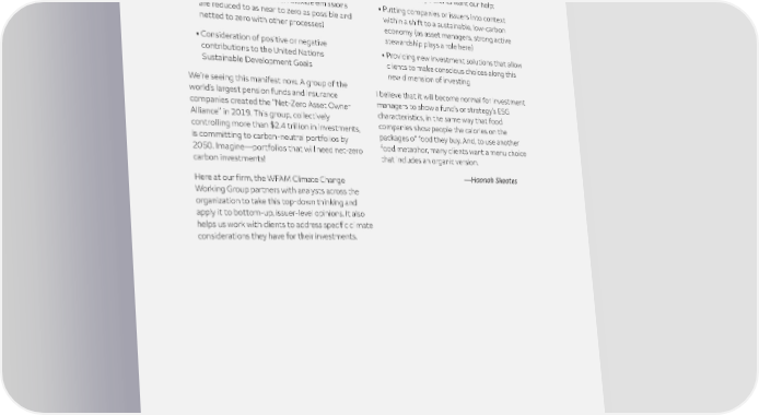 Continued from page 10 Many investors now envision a different picture Compared with a decade ago, when a client’s for our future: a sustainable one, widely framed strategy may have focused on excluding certain through a combination of: types of companies or issuers from their • A global transition to a “net-zero” carbon investments, today’s clients want our help: economy (in which carbon dioxide emissions • Putting companies or issuers into context are reduced to as near to zero as possible and within a shift to a sustainable, low-carbon netted to zero with other processes) economy (as asset managers, strong active • Consideration of positive or negative stewardship plays a role here) contributions to the United Nations • Providing new investment solutions that allow clients to make conscious choices along this Sustainable Development Goals new dimension of investing We’re seeing this manifest now. A group of the world’s largest pension funds and insurance I believe that it will become normal for investment managers to show a fund’s or strategy’s ESG companies created the “Net-Zero Asset Owner characteristics, in the same way that food Alliance” in 2019. This group, collectively controlling more than $2.4 trillion in investments, companies show people the calories on the is committing to carbon-neutral portfolios by packages of food they buy. And, to use another 2050. Imagine—portfolios that will need net-zero food metaphor, many clients want a menu choice that includes an organic version. carbon investments! —Hannah Skeates Here at our firm, the WFAM Climate Change Working Group partners with analysts across the organization to take this top-down thinking and apply it to bottom-up, issuer-level opinions. It also helps us work with clients to address specific climate considerations they have for their investments. 27 2020
