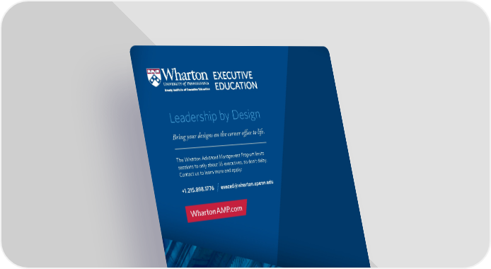 eadership by Design Bring your designs on the corner office to life. he Wharton Advanced Management Program limits sessions to only about 55 executives, so don’t delay. ˆontact us to learn more and apply™ ¡1.–1™.898.1¢¢— e„eced£Œharton.upenn.edu © Wharton…Pco†