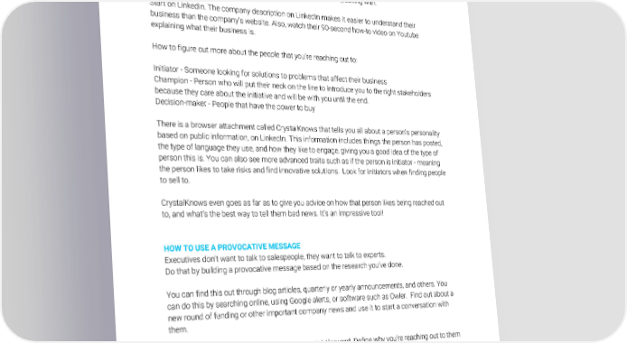 B L U E P R I N T HOW TO DEVELOP RELATIONSHIPS ONLINE Once you complete the stakeholder meeting, you’ll have an idea of their decision criteria and it becomes downhill selling. USING ONLINE RESEARCH TO UNDERSTAND YOUR STAKEHOLDERS Before every meeting, it’s very valuable to research who you’re speaking with. Start on LinkedIn. The company description on LinkedIn makes it easier to understand their business than the company’s website. Also, watch their 90-second how-to video on Youtube explaining what their business is. How to figure out more about the people that you’re reaching out to: Initiator - Someone looking for solutions to problems that affect their business Champion - Person who will put their neck on the line to introduce you to the right stakeholders because they care about the initiative and will be with you until the end. Decision-maker - People that have the power to buy There is a browser attachment called CrystalKnows that tells you all about a person’s personality based on public information, on LinkedIn. This information includes things the person has posted, the type of language they use, and how they like to engage, giving you a good idea of the type of person this is. You can also see more advanced traits such as if the person is initiator - meaning the person likes to take risks and find innovative solutions. Look for initiators when finding people to sell to. CrystalKnows even goes as far as to give you advice on how that person likes being reached out to, and what’s the best way to tell them bad news. It’s an impressive tool! HOW TO USE A PROVOCATIVE MESSAGE Executives don’t want to talk to salespeople, they want to talk to experts. Do that by building a provocative message based on the research you’ve done. You can find this out through blog articles, quarterly or yearly announcements, and others. You can do this by searching online, using Google alerts, or software such as Owler. Find out about a new round of funding or other important company news and use it to start a conversation with them. The provocative statement starts off very straightforward. Define why you’re reaching out to them based on the situation and pain you’ve gathered. If you can, reference someone you’ve already spoken to within the company to validate what you’re describing. Once you’ve set the stage, focus on the value prop- in your customer’s context. Mention one thing you think will have the biggest impact, based on your research, and the critical event based on what you think other companies like them might be struggling with.