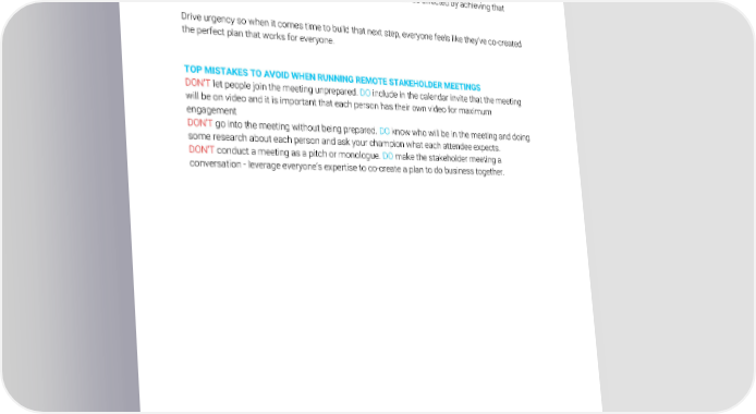 B L U E P R I N T REMOTE STAKEHOLDER MEETINGS In reality, people are very motivated by emotional factors. You can drive urgency by blending the things individuals are looking to improve upon with company initiatives. We’ve discussed having the champion introduce the meeting when it begins. When we have a big idea that everyone is aligned on this helps everyone focus on the one big goal that everyone can achieve together. Then point out how each different person can be affected by achieving that dream. Drive urgency so when it comes time to build that next step, everyone feels like they’ve co-created the perfect plan that works for everyone. TOP MISTAKES TO AVOID WHEN RUNNING REMOTE STAKEHOLDER MEETINGS DON’T let people join the meeting unprepared. DO include in the calendar invite that the meeting will be on video and it is important that each person has their own video for maximum engagement DON’T go into the meeting without being prepared. DO know who will be in the meeting and doing some research about each person and ask your champion what each attendee expects. DON’T conduct a meeting as a pitch or monologue. DO make the stakeholder meeting a conversation - leverage everyone’s expertise to co-create a plan to do business together.