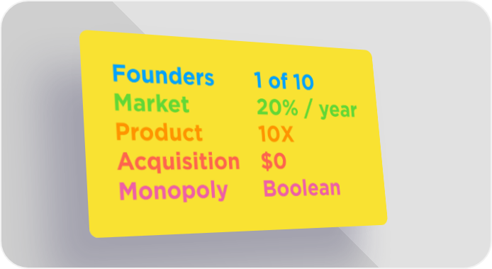 Founders 1 of 10 Market 20% / year Product 10X Acquisition $0 Monopoly Boolean