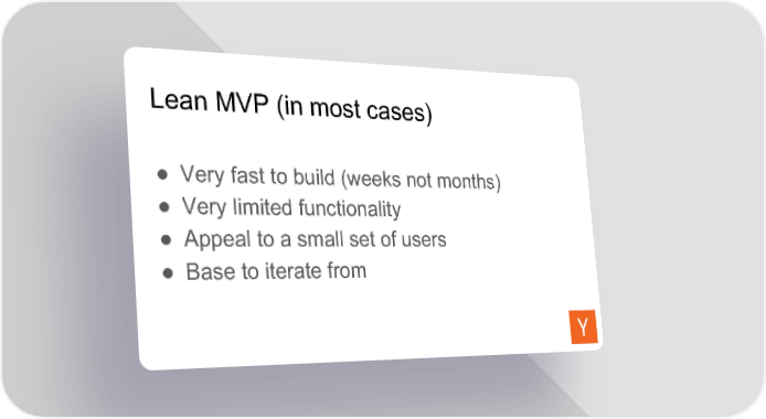 Lean MVP (in most cases) ● Very fast to build (weeks not months) ● Very limited functionality ● Appeal to a small set of users ● Base to iterate from