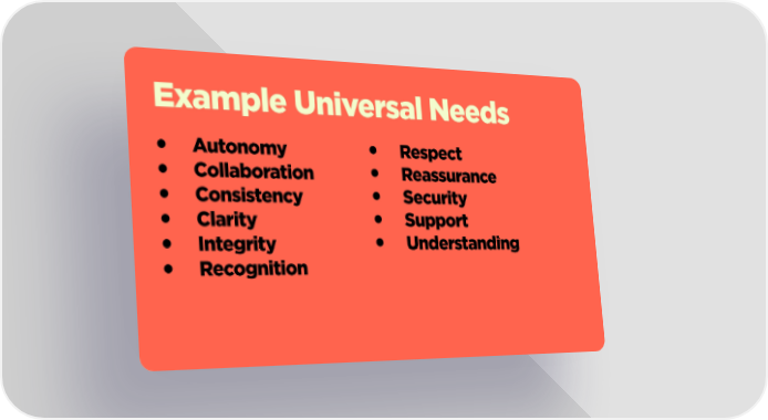 Example Universal Needs • Autonomy • Respect • Collaboration • Reassurance • Consistency • Security • Clarity • Support • Integrity • Understanding • Recognition