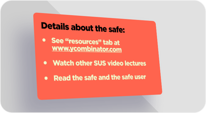 Details about the safe: • See “resources” tab at www.ycombinator.com • Watch other SUS video lectures • Read the safe and the safe user