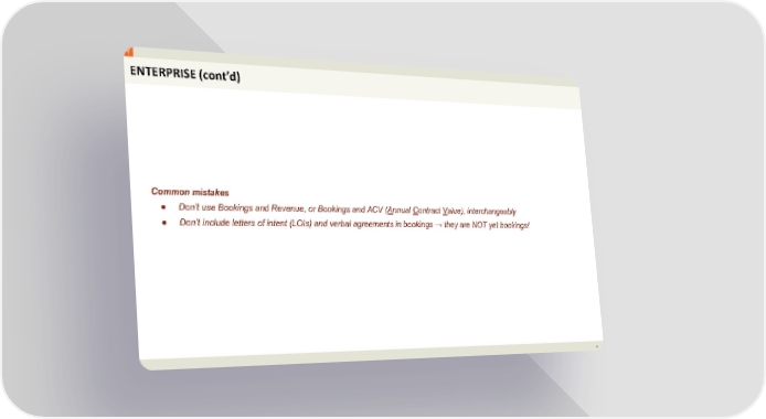 ENTERPRISE (cont’d) Common mistakes ● Don’t use Bookings and Revenue, or Bookings and ACV (Annual Contract Value), interchangeably ● Don’t include letters of intent (LOIs) and verbal agreements in bookings → they are NOT yet bookings! 4