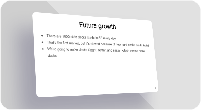 Future growth ● There are 1000 slide decks made in SF every day ● That’s the first market, but it’s slowed because of how hard decks are to build ● We’re going to make decks bigger, better, and easier, which means more decks 9