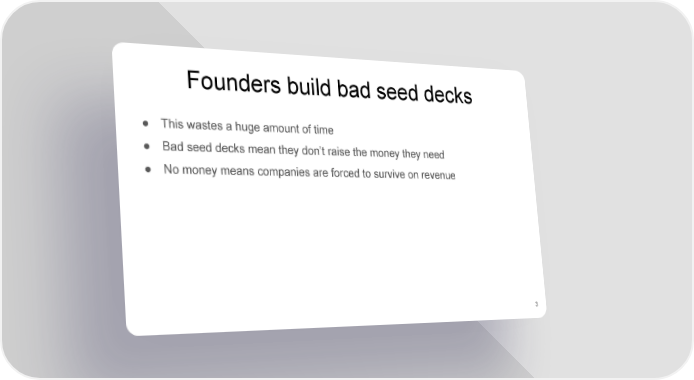 Founders build bad seed decks ● This wastes a huge amount of time ● Bad seed decks mean they don’t raise the money they need ● No money means companies are forced to survive on revenue 3 YC seed Page 2 Page 4